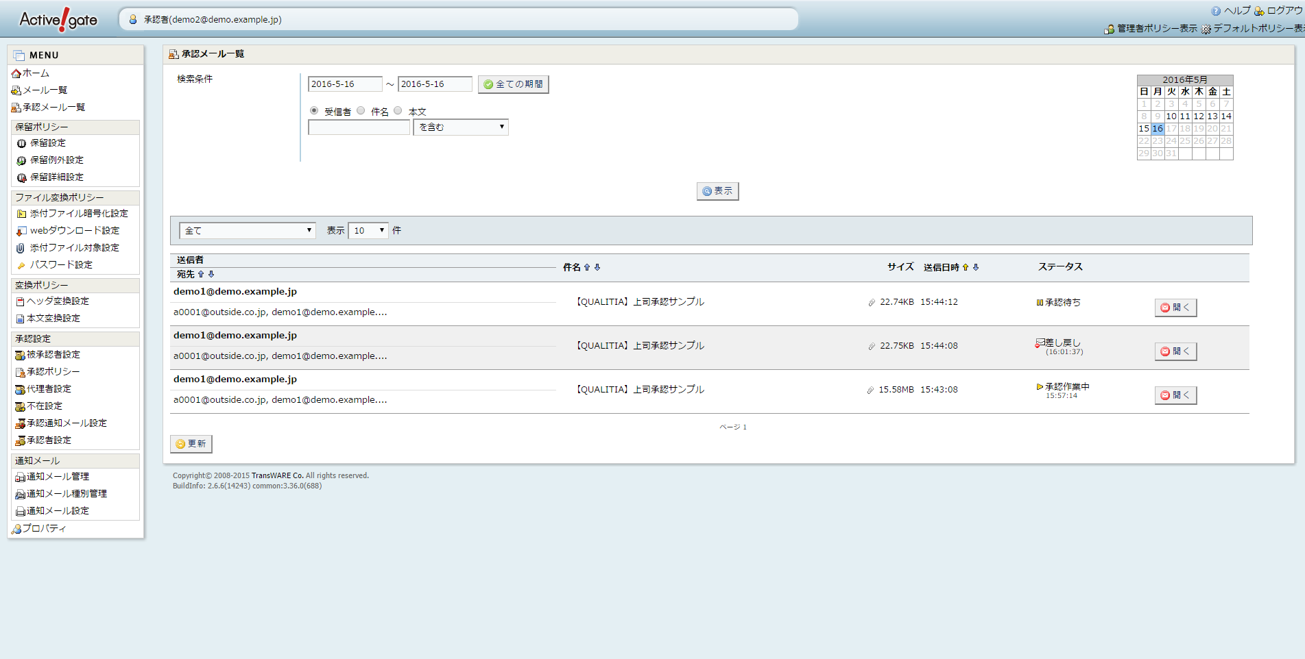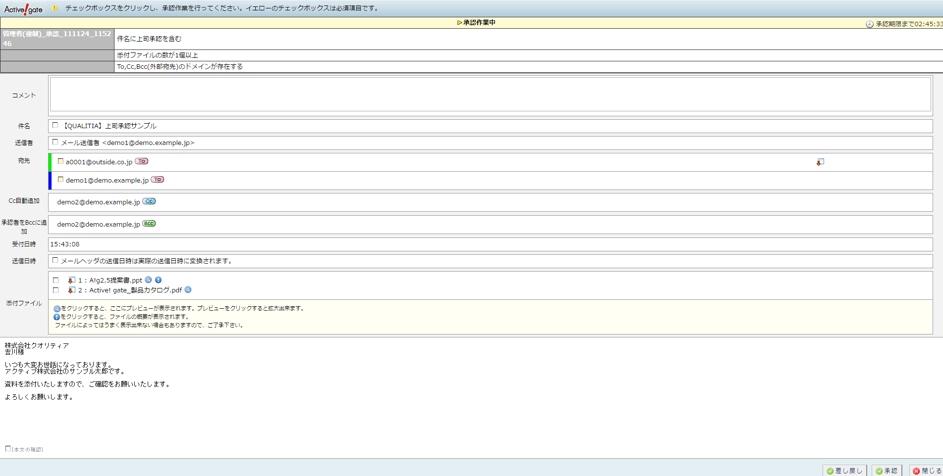 添付ファイル、件名およびメール本文のいずれかに「見積書」の文字が含まれている場合は、上司承認機能で送信前にすべて承認者がチェックすることで、内部統制に係るコンプライアンス強化を実現します。