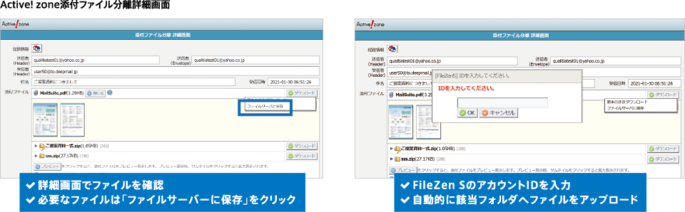 メールを受信したユーザは、添付ファイル分離詳細画面で確認したファイルを FileZen S にある個人のIDめがけてアップロードを行う
