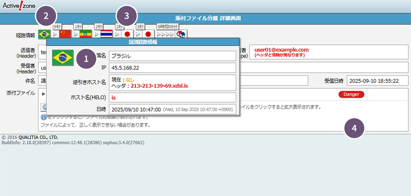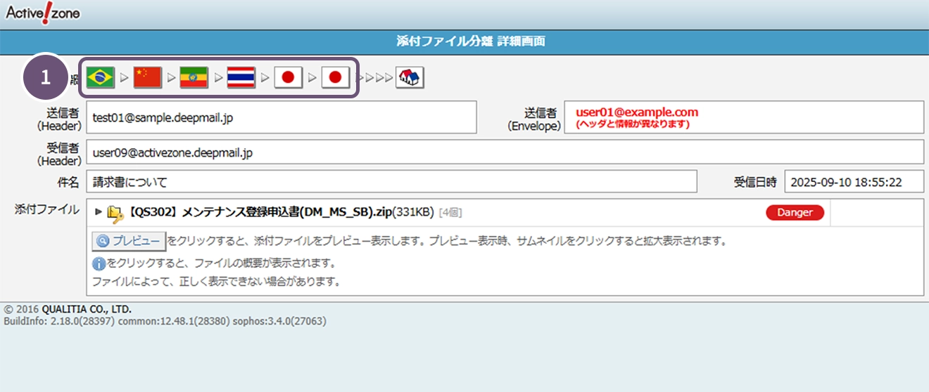 Active! zoneでは、どこの国を経由して届いたメールなのかを国旗を使って受信画面に表示します。複数の国を経由していると「なりすまし」や「標的型メール攻撃」の可能性が高いため、ITリテラシーがあまり高くないユーザーも一目で判別することができるインターフェースを用いて受信経路への注意を喚起し、感染のリスクを大幅に軽減します。
