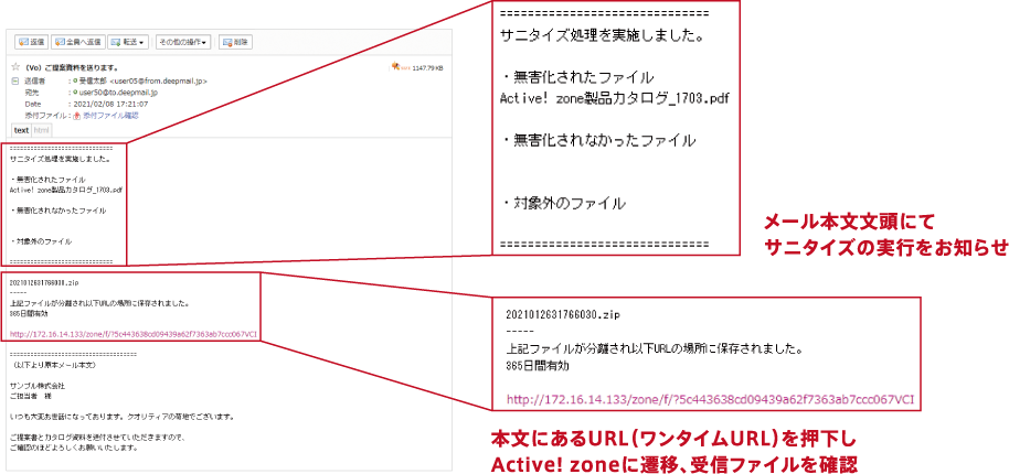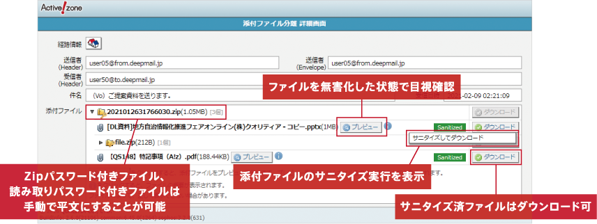 「Active! zone」と「VOTIRO Disarmer」との連携により、 「Active! zone」が実行する Microsoft Office 系(Word、Excel、PowerPoint) や PDF を中心としたマクロ除去に加えて、「VOTIRO Disarmer」の Positive Selection テクノロジー(CDR技術をさらに進化させた最新技術)を用いて、悪意の有無にかかわらず、 すべての対象ファイルを再帰的かつ高い原本性で無害化します。 パスワードファイルにおいても「Active! zone」の添付ファイル分離画面で解凍後、 ダウンロードする前に VOTIRO でサニタイズすることができるようになります。 また、シグネチャの存在しない未知の攻撃も防御すると同時に、パターン更新や誤検知からの解放も実現します。
